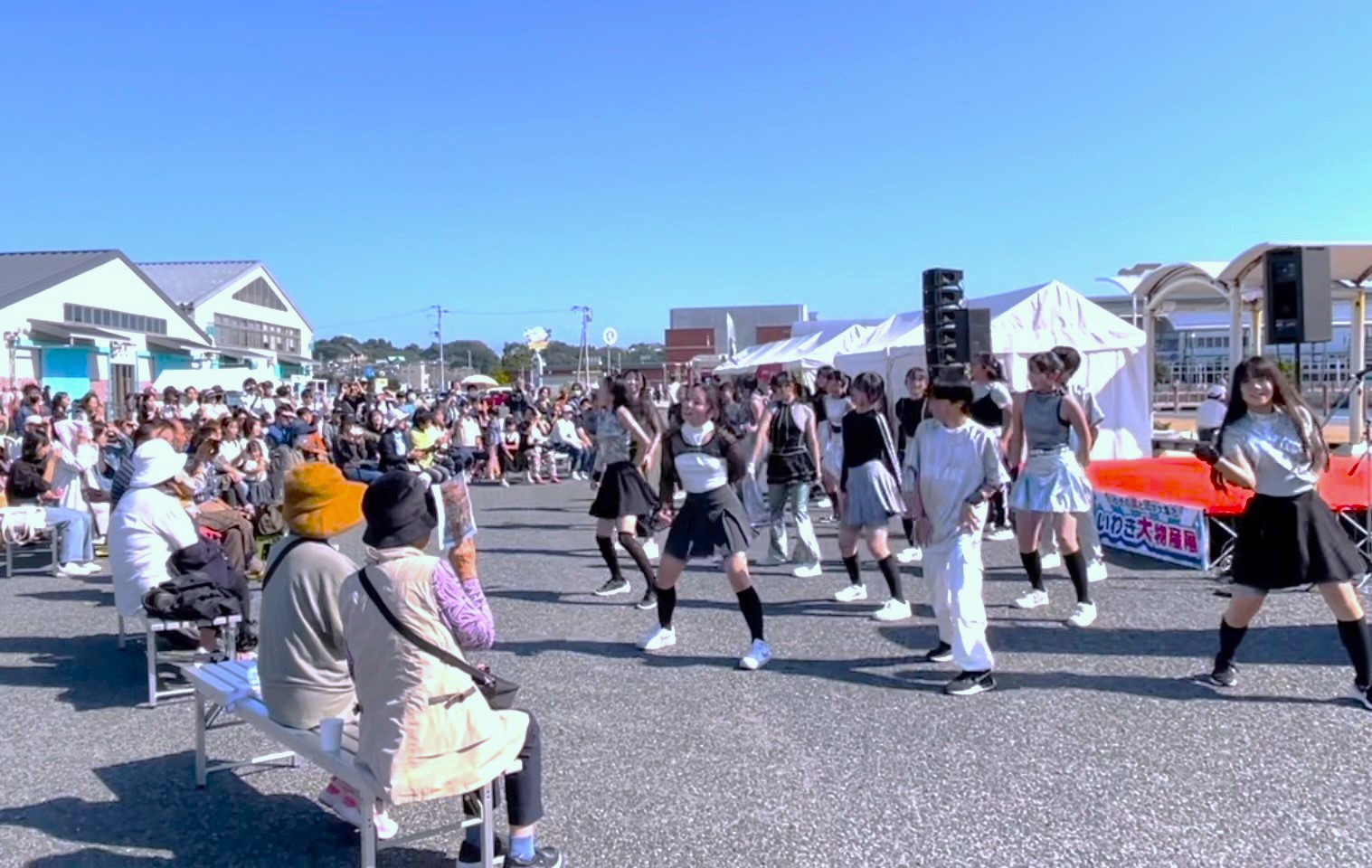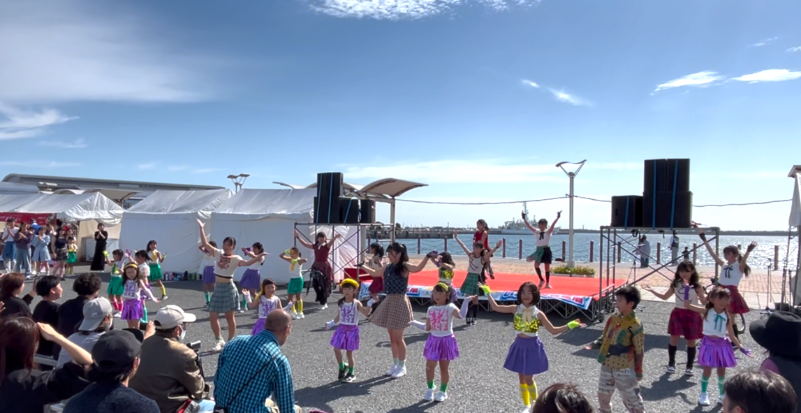 小名浜のいわきマリンパークにて、いわき市のうまいもの再発見!のイベント、「いわき大物産展」が開催されました。沢山のおいしそうなお店が並び、食事を楽しむ人や、お買い物で並ぶ人など、人がいっぱいの会場の中、リトルさんから高校生までのメンバーでダンスを披露いたしました。この日は曇り空から晴天になり、青く輝く海の目の前で、ダンスを披露いたしました。足を止めていただき、温かい拍手や応援をありがとうございました。 -
